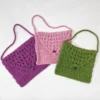 Hand crocheted purse, with shoulder sling, and buttoned flap closure. Approx size: 4.25 in x 6.5 in. Choose from 2 colors: Lime green or Purple.
